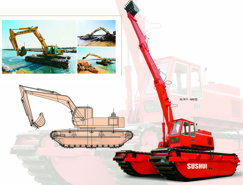 SLWY60型水陸兩用全液壓?jiǎn)味仿膸酵诰驒C(jī)系我公司制造的清淤機(jī)系列產(chǎn)品,經(jīng)過(guò)部級(jí)鑒定,該機(jī)性能先進(jìn)、機(jī)動(dòng)靈活、工作效率高,并能自行出入水域、上下河坡,可在陸地、水中、淤泥地、輕沼澤地和雜草地帶施工作業(yè)。